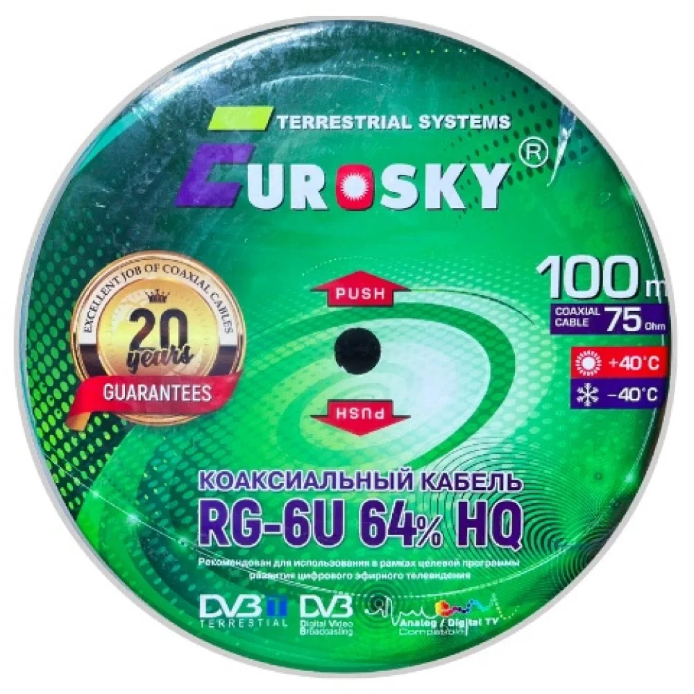 Кабель коаксиальный EUROSKY RG-6U, 75 Ом, CCS/Al/Al, 64%, бухта 100 м. ,белый с полосой.