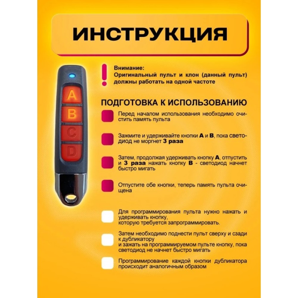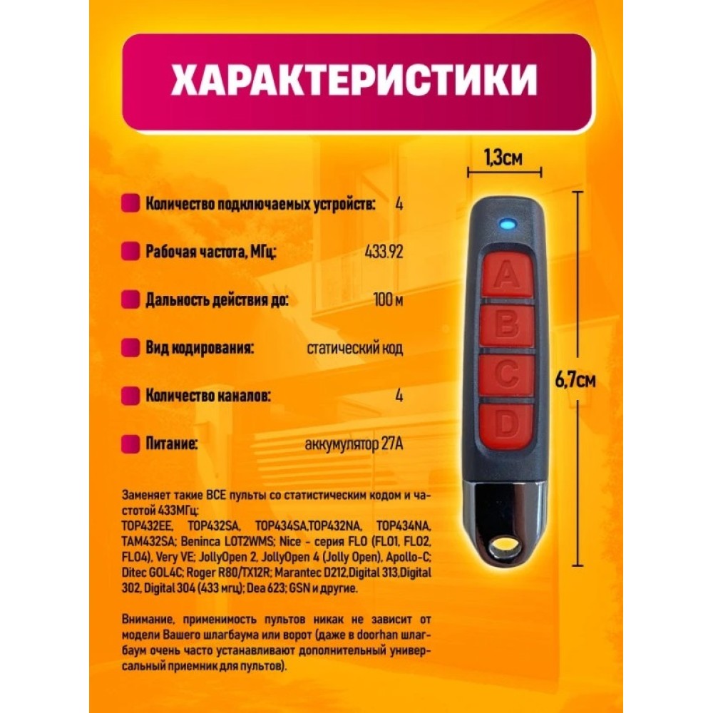 Пульт Apollo Jolly универсальный Long подходит для управления шлагбаумами, воротами, роллетами и маркизами. 4-х канальный, позволяет управлять сразу четырьмя устройствами. Работает на частоте 433 МГц.Пульт APOLLO JOLLY Long используется для изготовления дополнительной копии пульта. При помощи него можно получить дополнительную копию пультов использующих фиксированный код. Для использования нового пульта Apollo Jolly 22 на него необходимо скопировать код от рабочего пульта. При вводе в режим программирования происходит очистка памяти и все ранее записанные коды удаляются. Ввод пульта в режим программирования необходим только при первой записи кода. Процесс предельно простой, описание есть в инструкции.Новый пульт компактный, что делает его очень удобным в хранении.Аполло Джолли заменяет следующие пульты:1. CAME: TOP432SA, TOP434SA,TOP432NA, TOP434NA, TAM432SA;2. Beninca LOT2WMS;3. Nice: серия FLO (FLO1, FLO2, FLO4), Very VE;4. Apollo: ApolloC, Apollo Tom, Tom2, Tom3;5. Ditec GOL4C;6. Roger R80/TX12R;7.