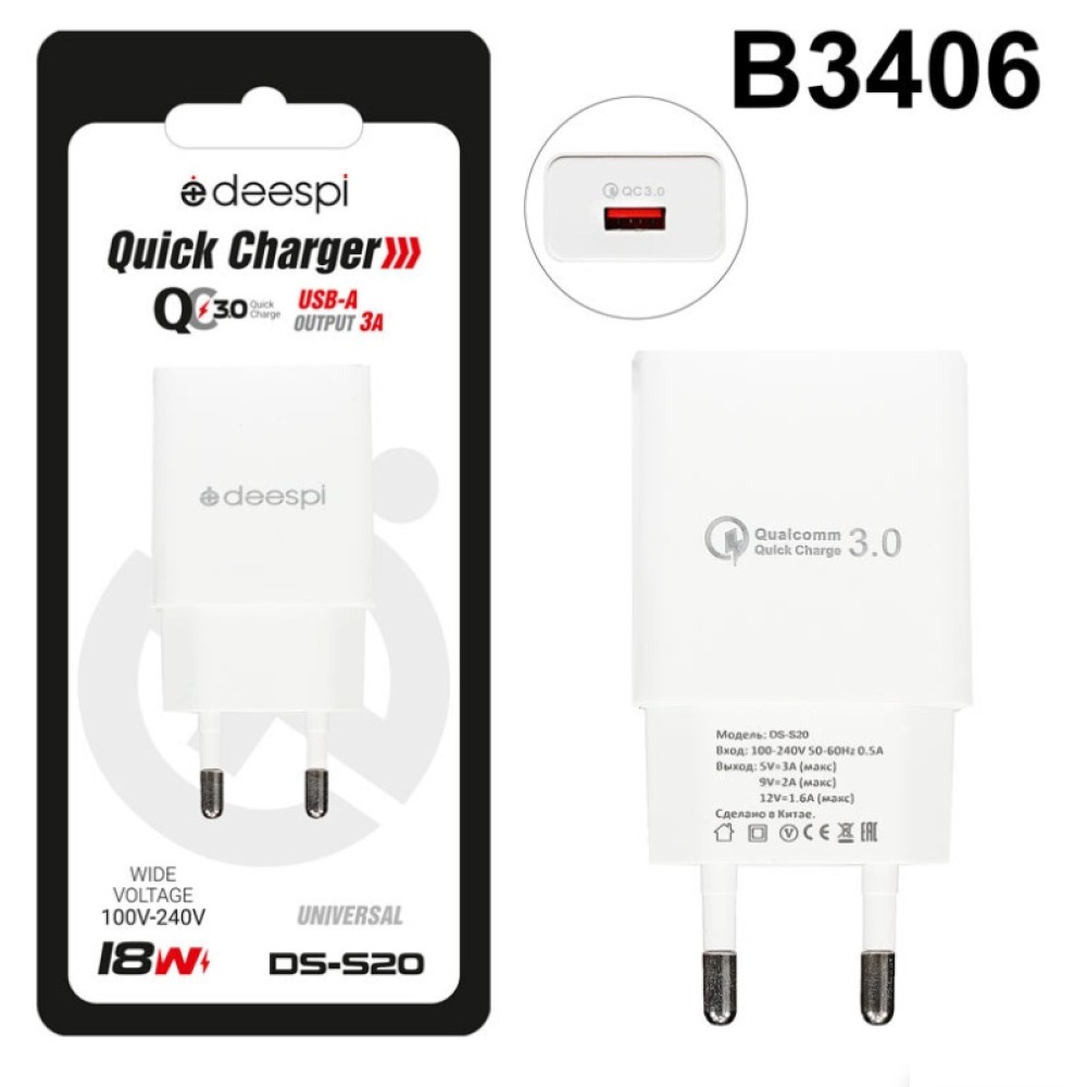 Сетевое зарядное устройство Deespi S20 5V/3.1A 1USB QC3.0 18W White (в блистере)